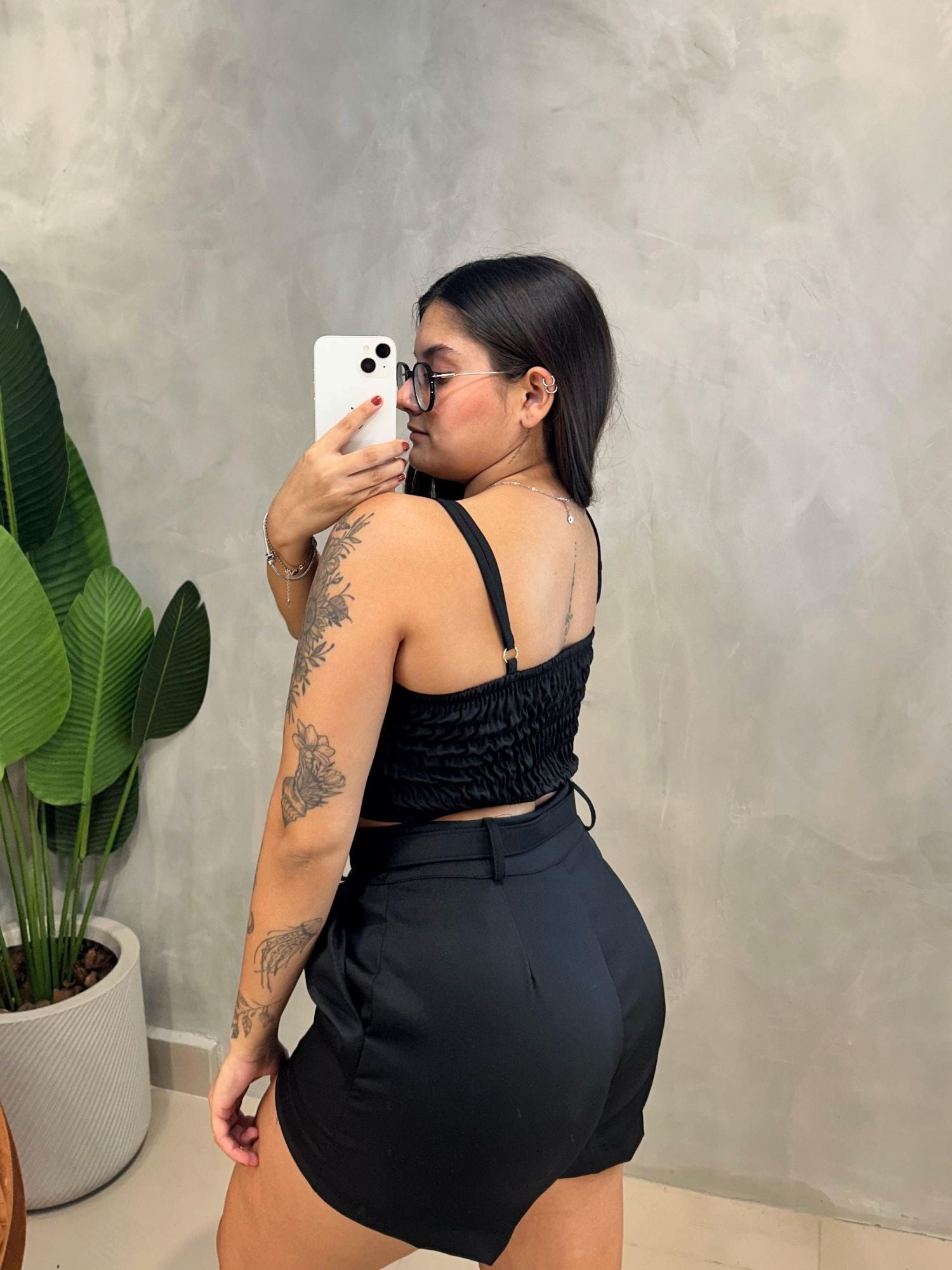 O Conjunto Anieli é confeccionado em tecido de alfaiataria premium, trazendo um visual moderno e sofisticado para qualquer ocasião. O cropped com alças regulåveis garante conforto e ajuste perfeito, enquanto o shorts com cinto valoriza a cintura e proporciona um caimento impecåvel.