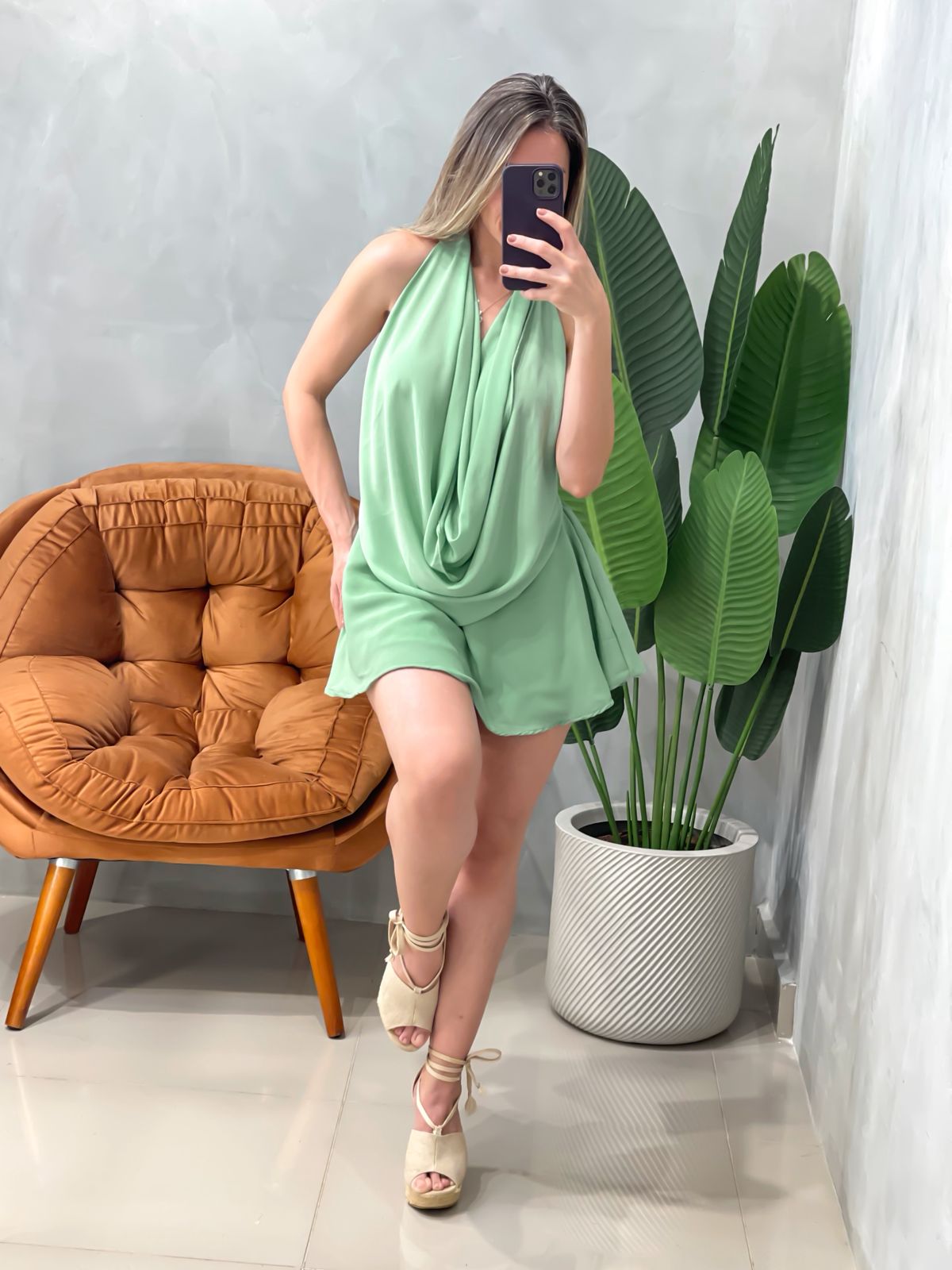 Conjunto em Crepinho Blusa Gola Boba e Shorts Saia