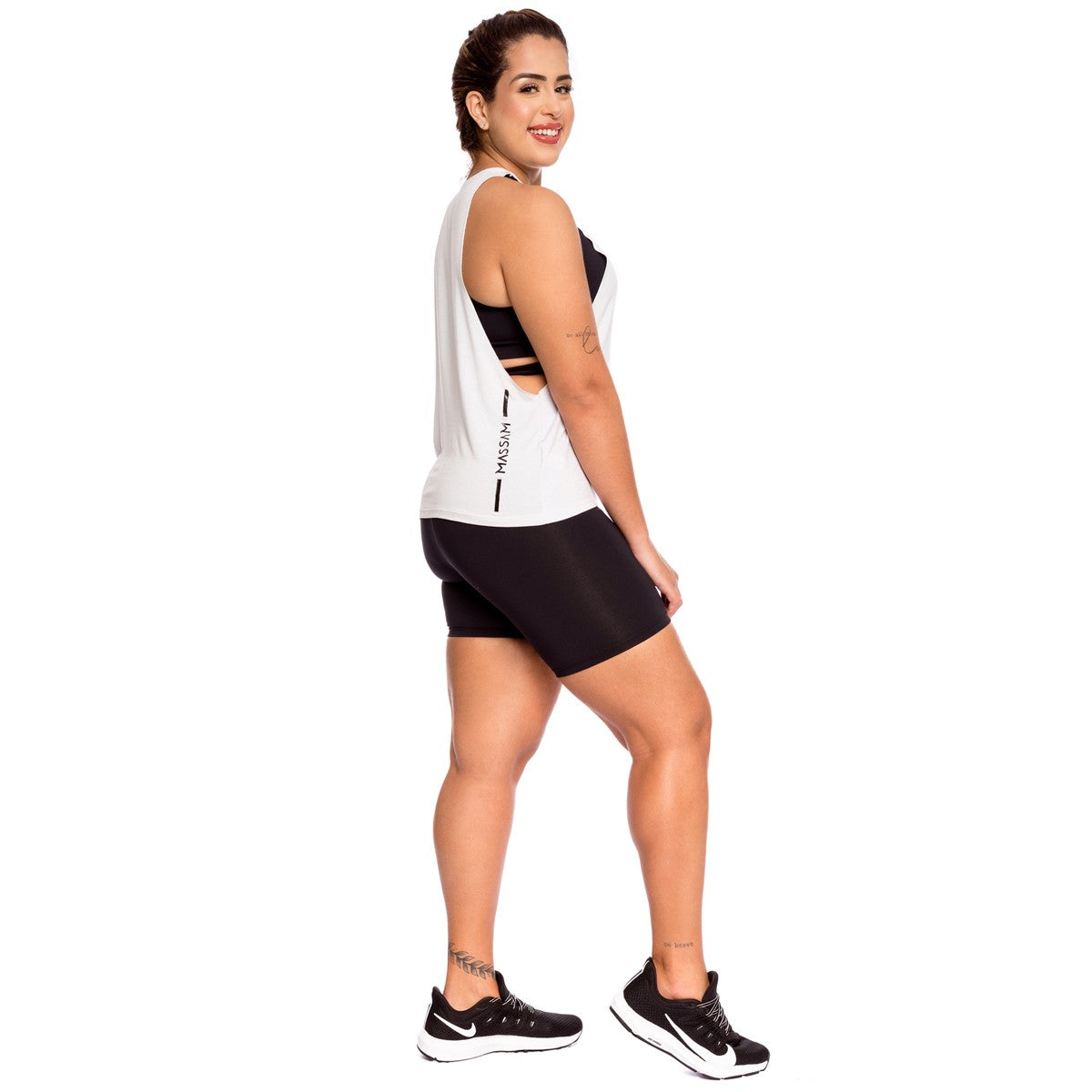 A Regata Branca Cavada Massam é a peça essencial para seus treinos e também para compor looks casuais de academia. Com modelagem básica e versátil, ela combina facilmente com diversas produções.